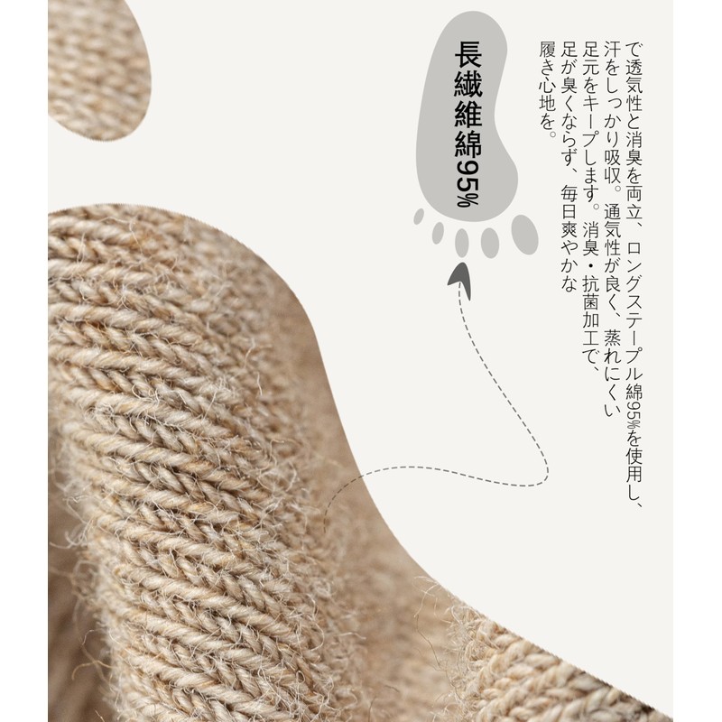- ロングステープル綿95%: で透気性と消臭を両立、ロングステープル綿95%を使用し、汗をしっかり吸収。通気性が良く、蒸れにくい足元をキープします。消臭・抗菌加工で、足が臭くならず、毎日爽やかな履き心地を
