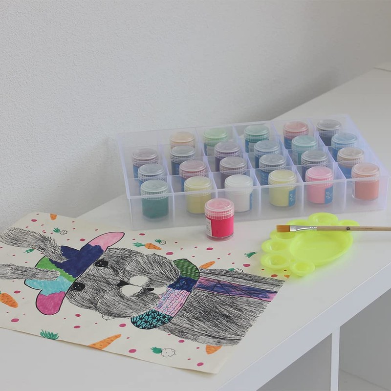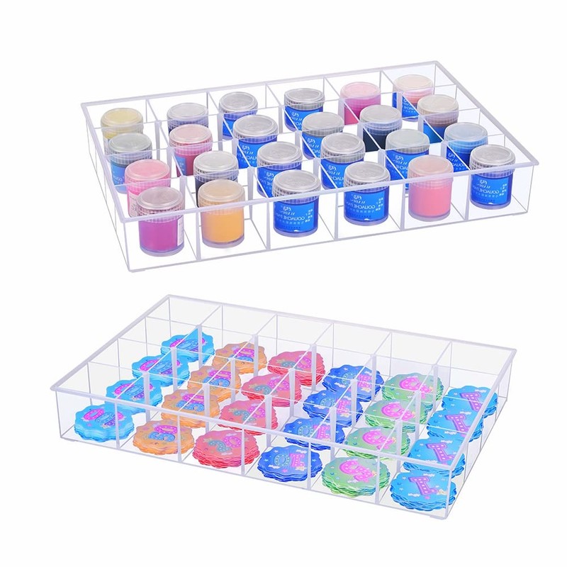 - Great for storing small oil paint jar, little bottles, puzzles pieces, screw, jewelry, sticker. Set includes 2 pack plastic drawer organizer tray with 24 fixed sections. Approx tray dimension in 13.40" L x 8.80" W x 2.00“ H. **No Lid**