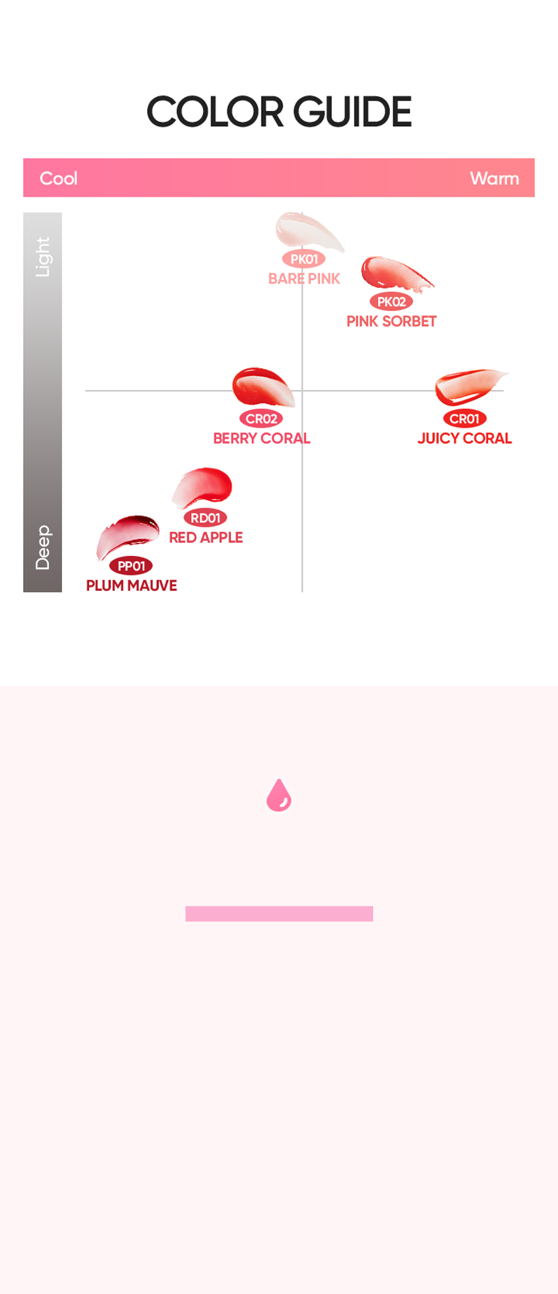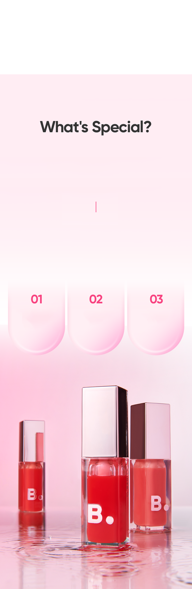 The high content of oil provides deep and intense hydration that lasts 24 hours. This lip oil gently alleviates rough dead skin cells. The high gloss aqua holding oil layer inhibits loss of moisture ingredients that are absorbed into skin. Contains 3 types of moisturizing oils and hydro 3 essential complex that are specialized to be applied on thin and dry lip structure. Jojoba oil has high skin affinity for quick absorption into thin lip skin, and sunflower seed oil contains ceramide to strengthen dry lip skin barrier, and canola oil helps maintain deep hydration of lips. Hyaluronic acids supply moisture inside skin, squalene maintains hydration on lip surface, and panthenol improves sensitive lips. Serum particles contain oil ingredients instead of heavy oil particles to provide moisturizing and non-sticky lightweight feeling of use like oil.
