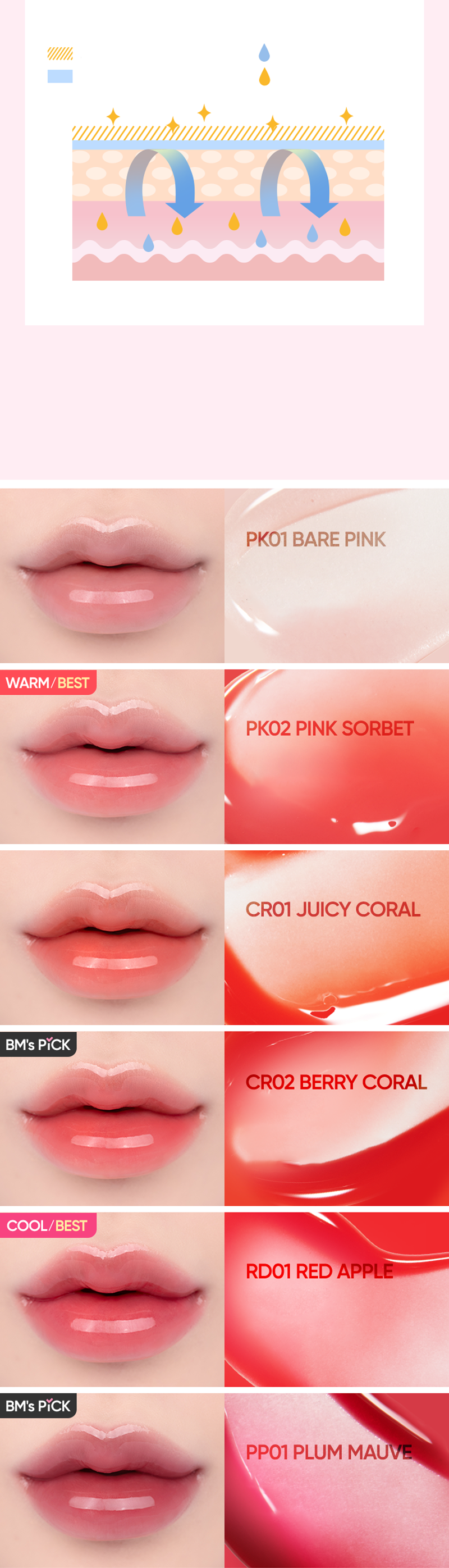 The deeply absorbing moisture makes soft lips without any rough texture without just coating lips. Provides smooth and nice glow on lips that does not smudge lip makeup. Completed skin irritation test for carefree use on lips, and acquired Italian V-label certification.