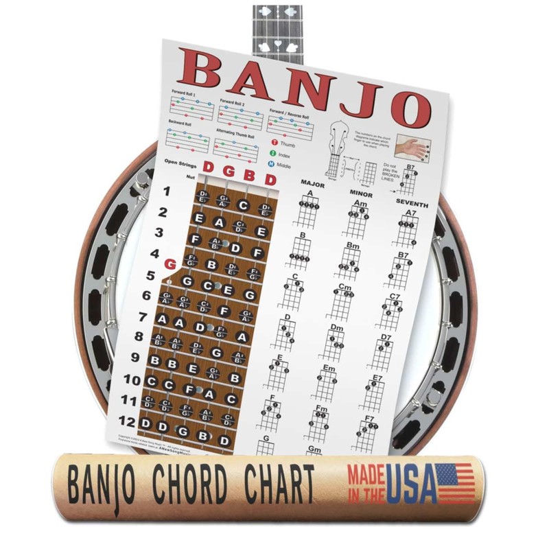Banjo Poster - Chords Rolls Fretboard Notes - Open G Tuning 11x17 Easy Beginner Instructional Chart by A New Song Music