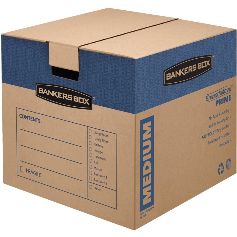Bankers Box Medium Prime Moving Box 8 Pack, Reinforced Handles, Tape-Free Assembly, Attached Lid, 18-in x 15-in x 14-in (0062806)