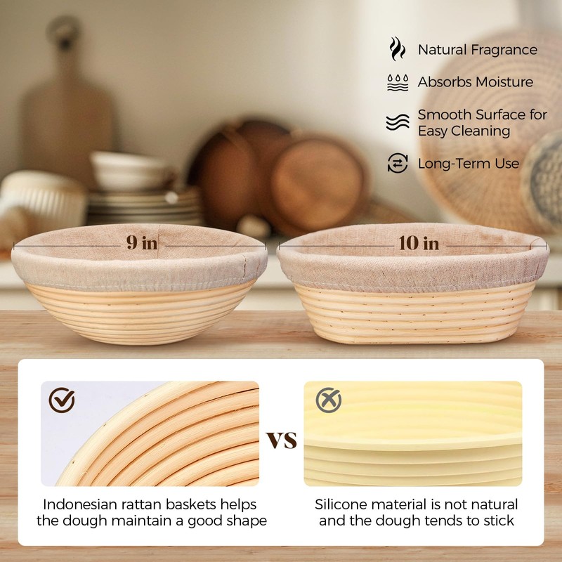 • Natural Bread proofing basket - Handcrafted from Indonesian rattan with a natural fragrance and a smooth surface, which is easy-cleaning. Also, natural rattan absorbs moisture and helps the dough to rise, making the bread tastier. These proofing baskets are good enough for long-term use.