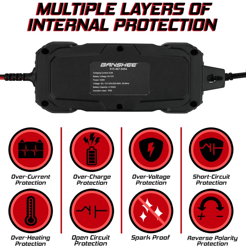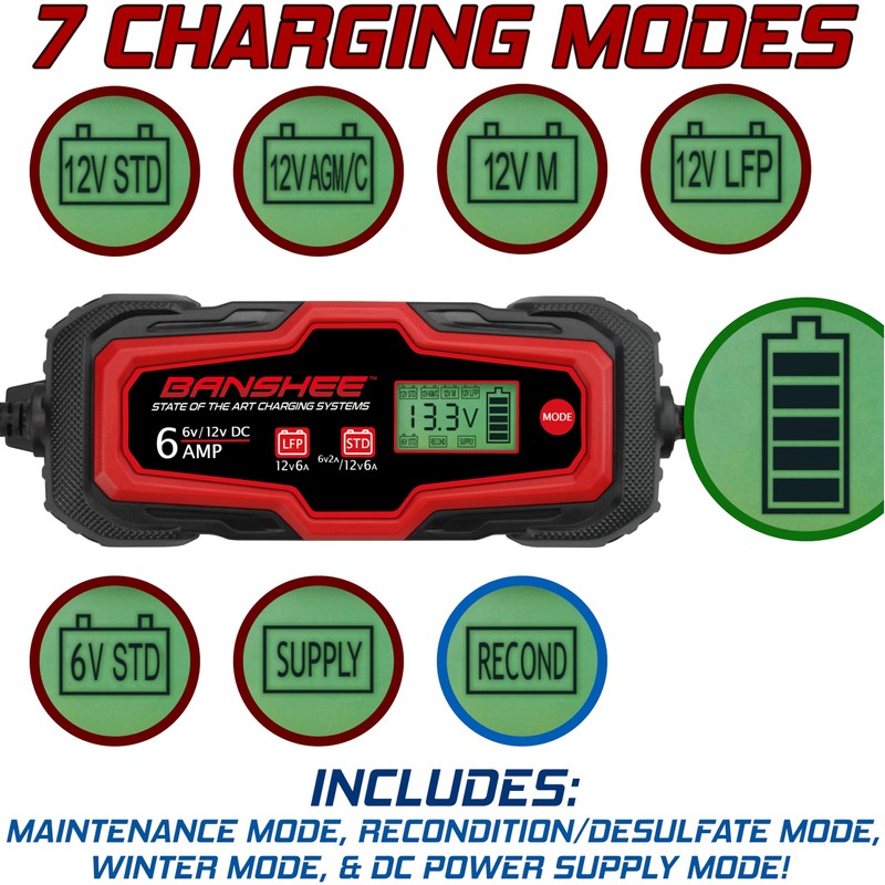 Banshee 6Amp 6V 12V Automatic Charger, Maintainer, & Desulfator for Powersports - Standard & Absorbed Glass Mat Lead Acid (Wet, STD, AGM) & LiFePO4 Batteries- LCD Display, Quick Connect