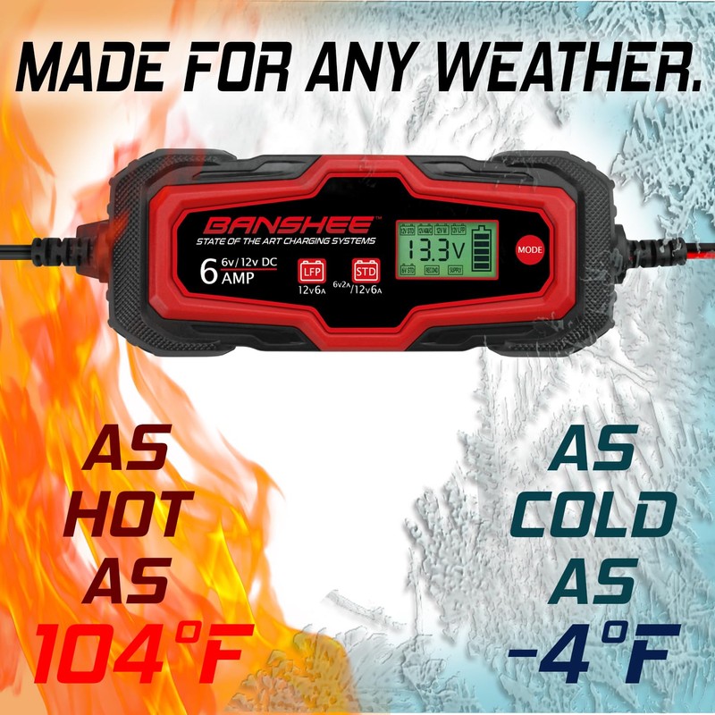 Introducing the 6 Amp Banshee 6V 12V Battery Smart Charger, featuring an IP65 rating and CE certification. Our charger is versatile, compatible with 6 Volt/12 Volt Standard Wet/Flooded Lead Acid Batteries, 12 Volt AGM (Absorbed Glass Mat) Lead Acid Batteries, and 12 Volt LiFePO4 Batteries. It efficiently charges batteries for cars, motorcycles, ATVs, RVs, boats, scooters, golf carts, lawn mowers, and ride-on toys. Other modes of charging include: Maintenance, Recondition/Desulfator, Supply (12V), Winter Smart, lightweight, and compact, this smart battery charger/maintainer is exceptionally user-friendly, especially in tight spaces. It ensures your battery remains fully charged and ready for use at any time. Utilizing a microprocessor-controlled program, the advanced technology revives the battery to a full charge without the risk of overcharging. Equipped with both alligator clips and ring terminals, connecting the smart battery charger is a breeze. Built to endure, the power battery charger features a fully sealed outer case, rendering it dust-resistant, oil-resistant, and anti-moisture. This design prevents corrosion and protects against the damaging effects of exposure to various weather conditions.