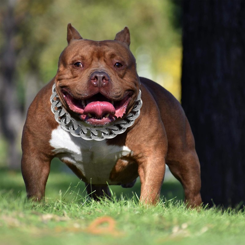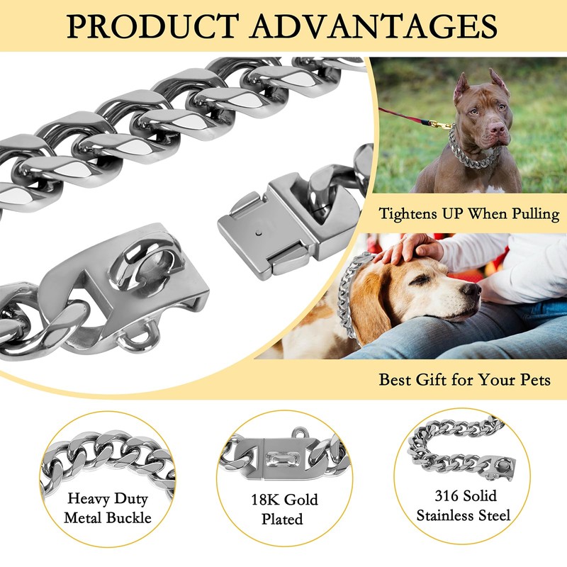 - Collar Sizing and Fit:The chain is 23MM wide and comes in lengths of 16" to 26".Please note that this chain is NOT adjustable,so please measure around your dog's neck with string or tape where you want the collar to lay,and then add about 1-2 inches.