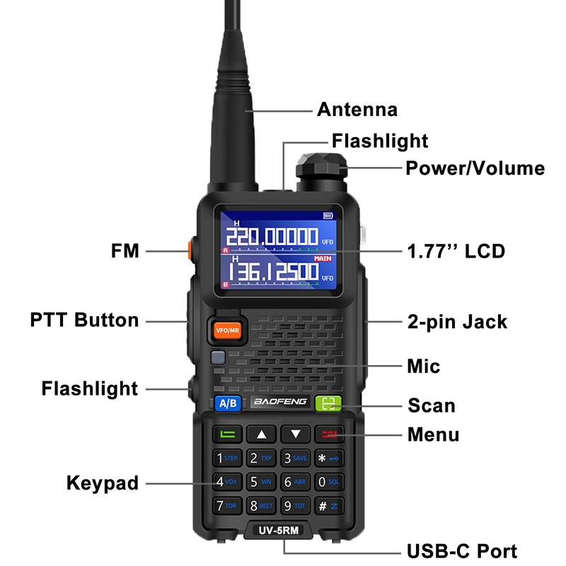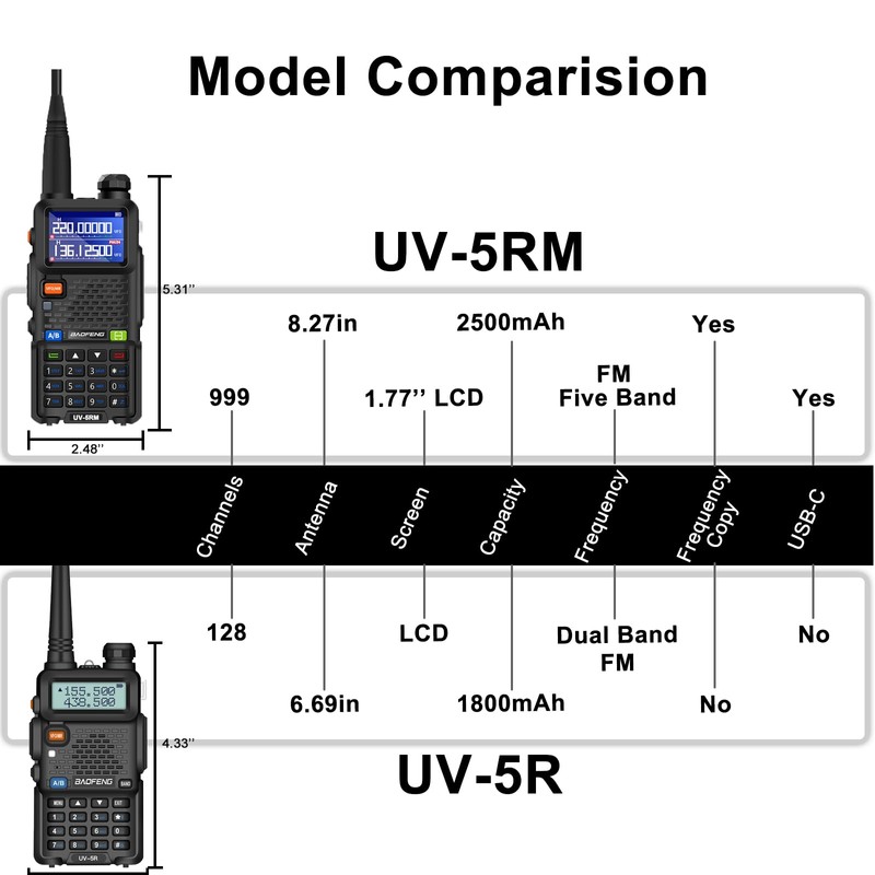 • BAOFENG UV-5RM two way radio is a reliable communication device designed for both outdoor enthusiasts and professionals. Enjoy long-range communication spanning 3-5 miles, ensuring connectivity in various environments, from camping and hiking to challenging work sites