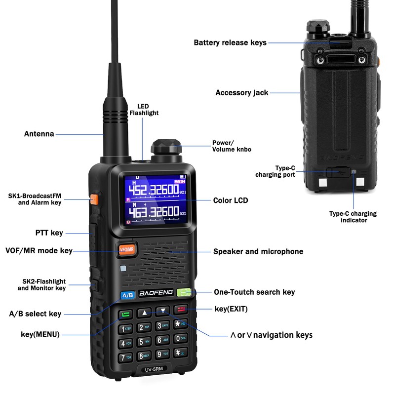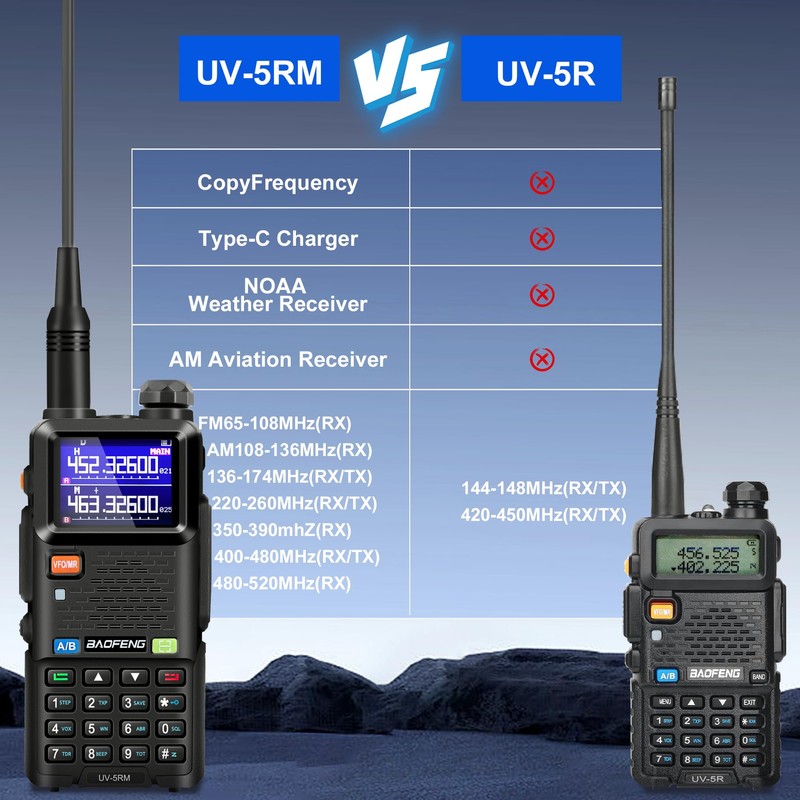 • Upgraded Version of UV-5R: The BAOFENG UV-5RM is an upgeaded version of the UV-5R, designed for durability and functionality. UV-5RM ham radio brings you 999 programmable channels covering aviation and police bands, an extended battery boost from 1800mAh to 2500mAh with USB-C charging, new one-key copy frequency function, and DTMF manual dial function. The radio boasts a larger 1.77’’ color display.