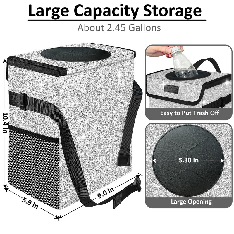 BAOGCOYO Car Trash Can for Car, Cute Mini Car Trash Bag with Lid, Glitter Car Garbage Can Bin Hanging for Back/Front Seat/Console, Waterproof, Leakproof, 2.5 Gallon, Silver Bling Sparkly