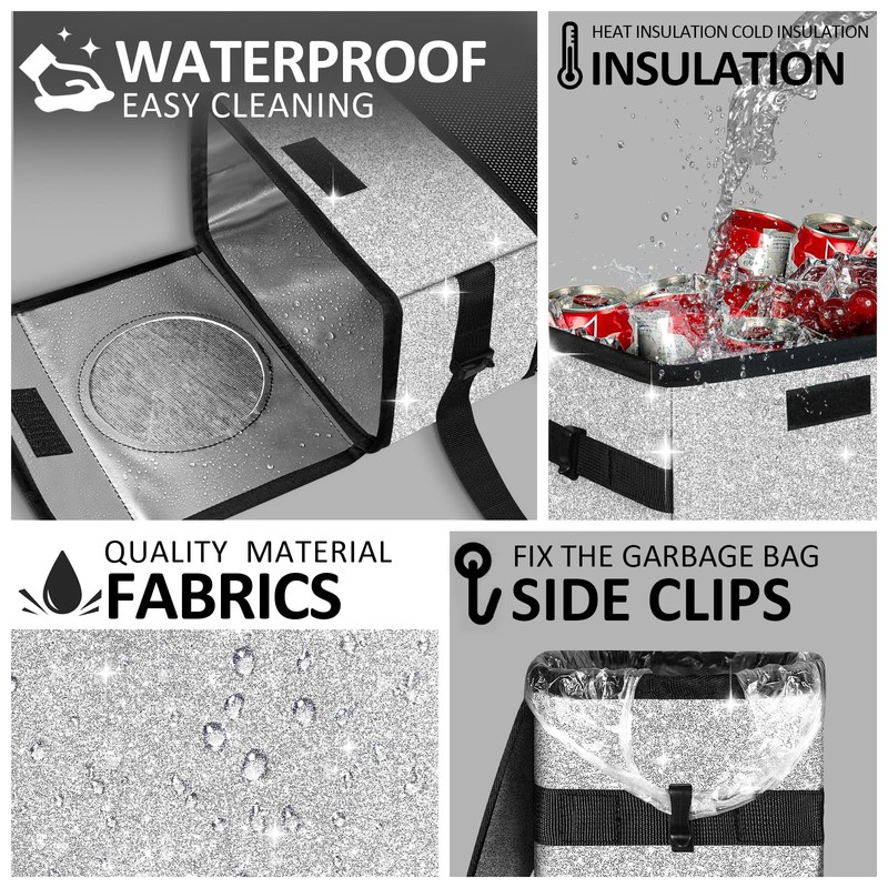• 【PRACTICAL DESIGN & MULTIFUNCTIONAL USE】With two side clasps to secure the disposable garbage bag, this garbage can for car also has three side pockets to store the trash or other items, such as mobile phones, umbrellas, water cups, etc. Having a large capacity and spacious opening, this car trash bag is not only able to hold a lot of garbage, but also serve as a car storage organizer, such as storing snacks, magazines, toys, etc.