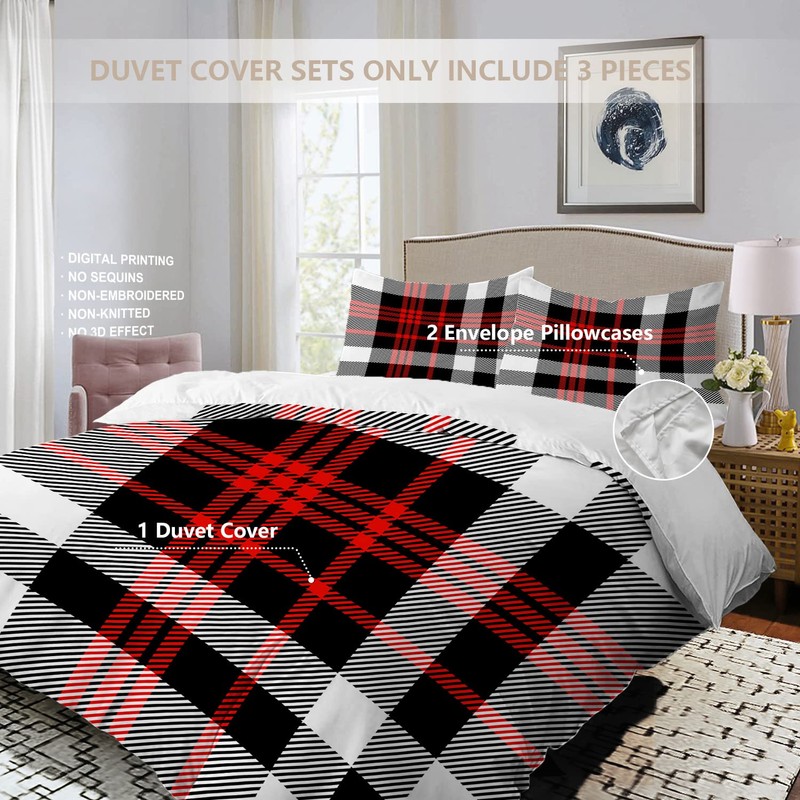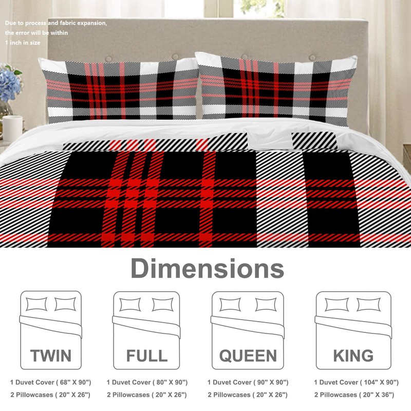BaoNews Tartan Checkered Duvet Cover Set King Size,3 Pieces Plaid Modern Abstract British Red Black Bedding Set Hotel Quality PolyesterComforter Cover Set with 2 Pillowcases(No Filler)