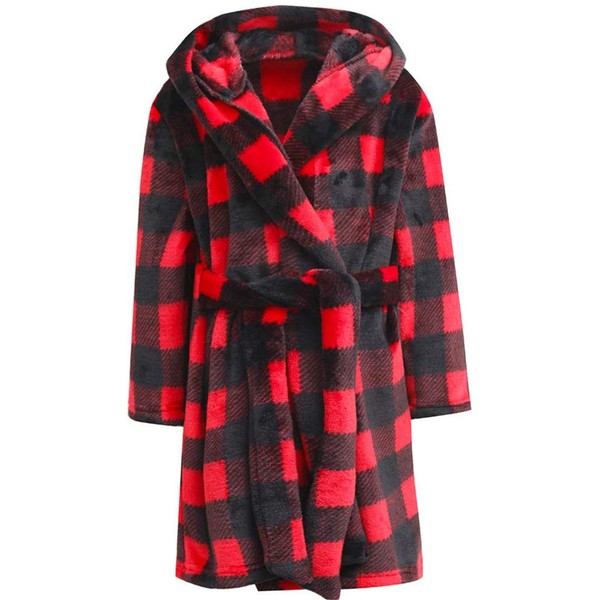 BAOPTEIL Kids Hooded Bathrobe Girls Plush Hooded Flannel Robe Boys Soft Bathrobe Sleepwear(Red Plaid,7-8 Years)