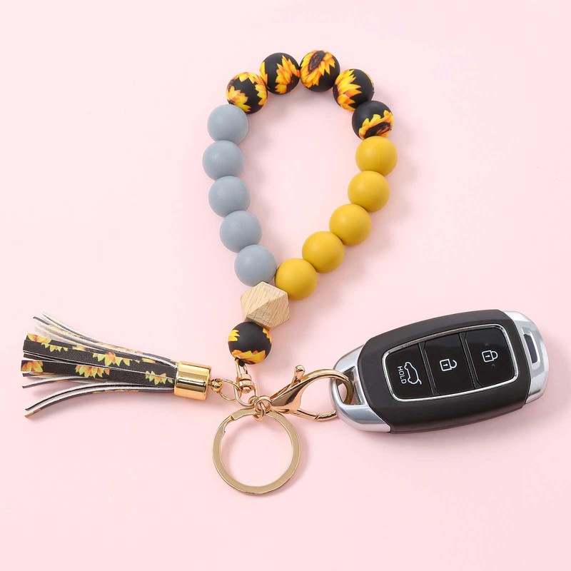 BAOSIWA Silicone Beaded Key Chain Bracelet Wristlet Keyring Sunflower Bangle Keychains for Women with Leather Tassel