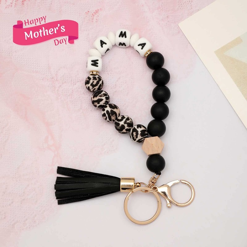BAOSIWA Silicone Beaded Mama Key Chain Bracelet Wristlet Keyring Leopard Bangle Keychains Mothers Day Gifts for Women with Leather Tassel