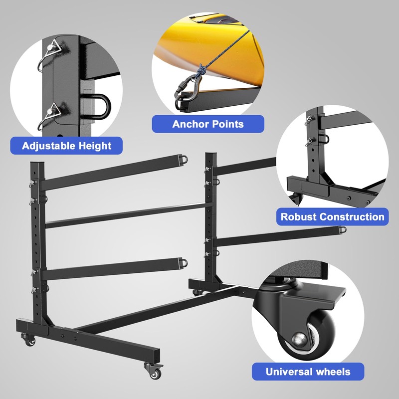 - 【Multi-Storage Space】With 2 levels of storage, the kayak stand provides plenty of room to store your kayaks, canoe, paddleboards, sup board and surfboards, or other water sports equipment. Keep your gear organized and easily accessible