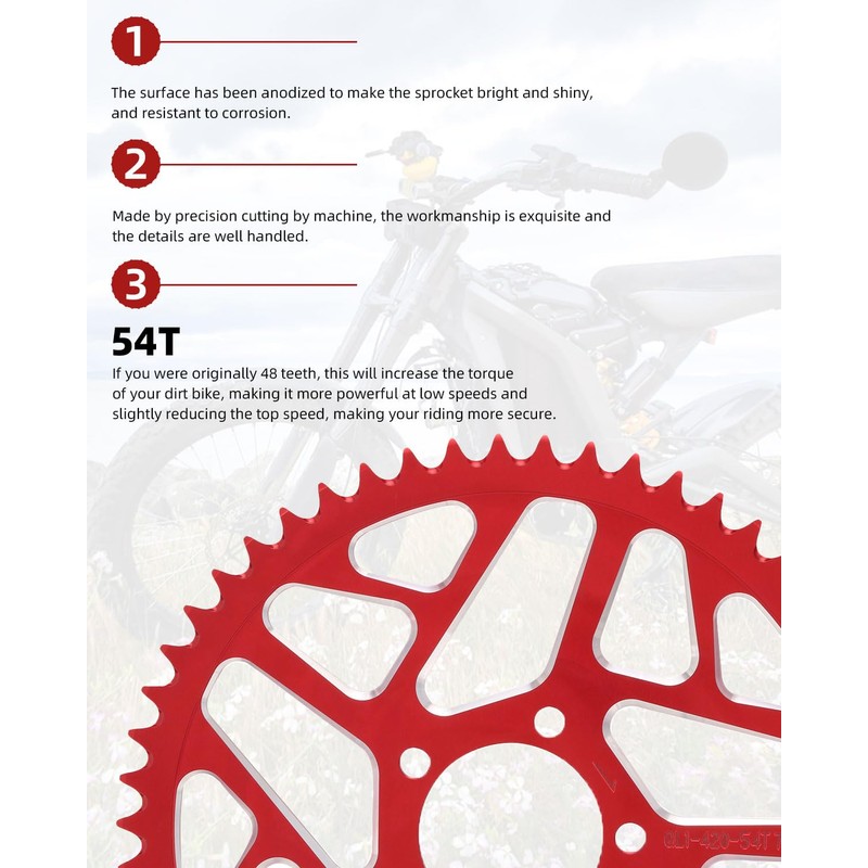 - [54 Teeth] Sprocket for Sur Ron X has 54 teeth. If you were originally 48 teeth, this will increase the torque of your dirt bike, making it more powerful at low speeds and slightly reducing the top speed, making your riding safer.
