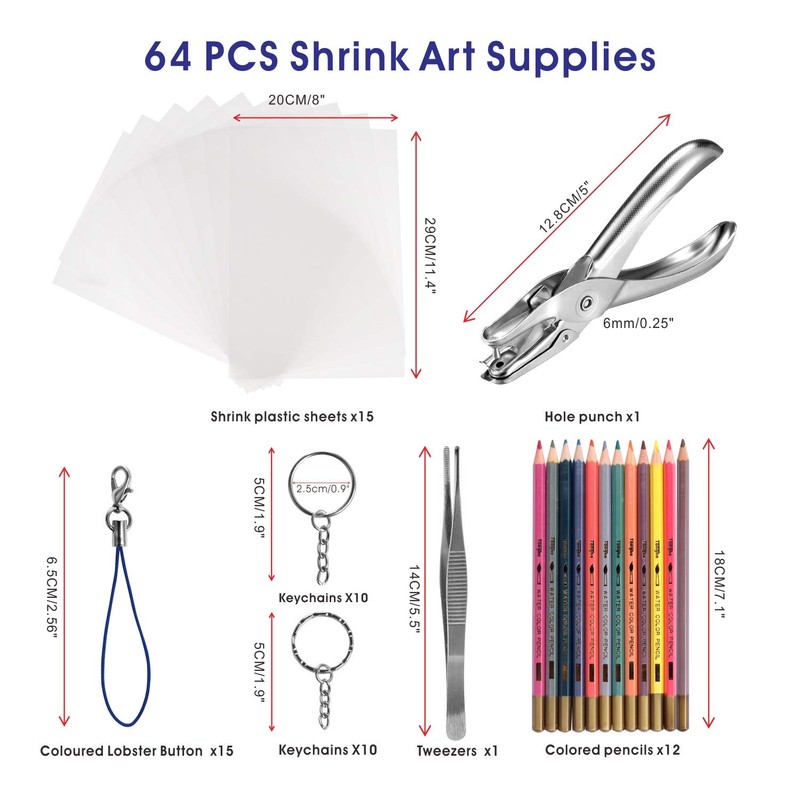 - 🎁84 in 1 Shrinky Dink Keychain Kit:15 x Shrink Film Sheet,12 x Color Pencils,20 x Keychains,15x Colored Lobster Clasp,1 x Hole Punch,1xTweezers, 20 pcs opening jump rings, great make for Mother's Day, Father's Day, Halloween,Christmas, graduation, birthday present,perfect for all age