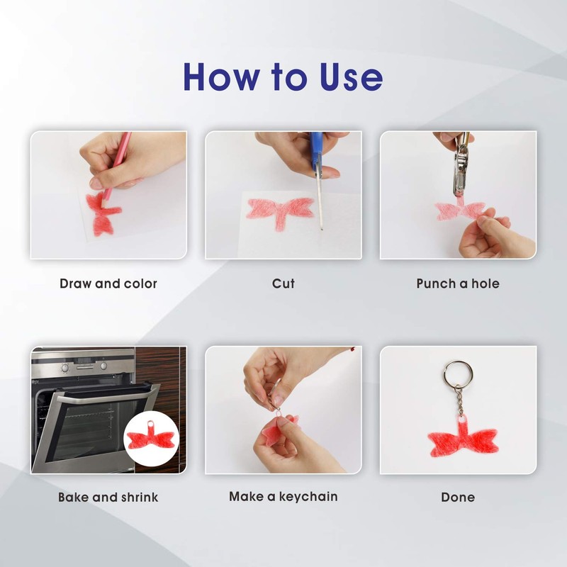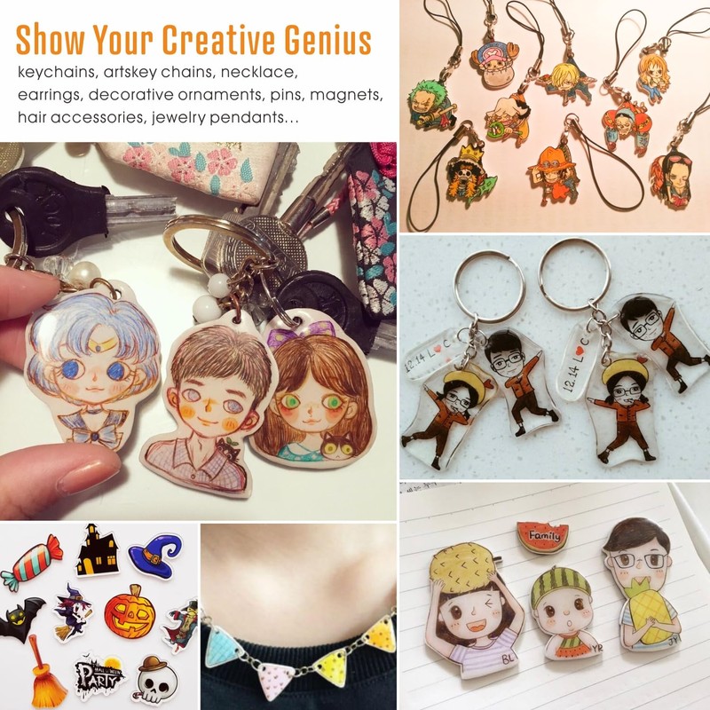- 🎈DIY YOUR OWN VARIOUS STYLE CRAFT:Shrink Dink Sheets Create keychains,artskey chains,necklace,earrings,decorative ornaments,pins,magnets,hair accessories, jewelry pendants and more.Endless fun of making shrink.
