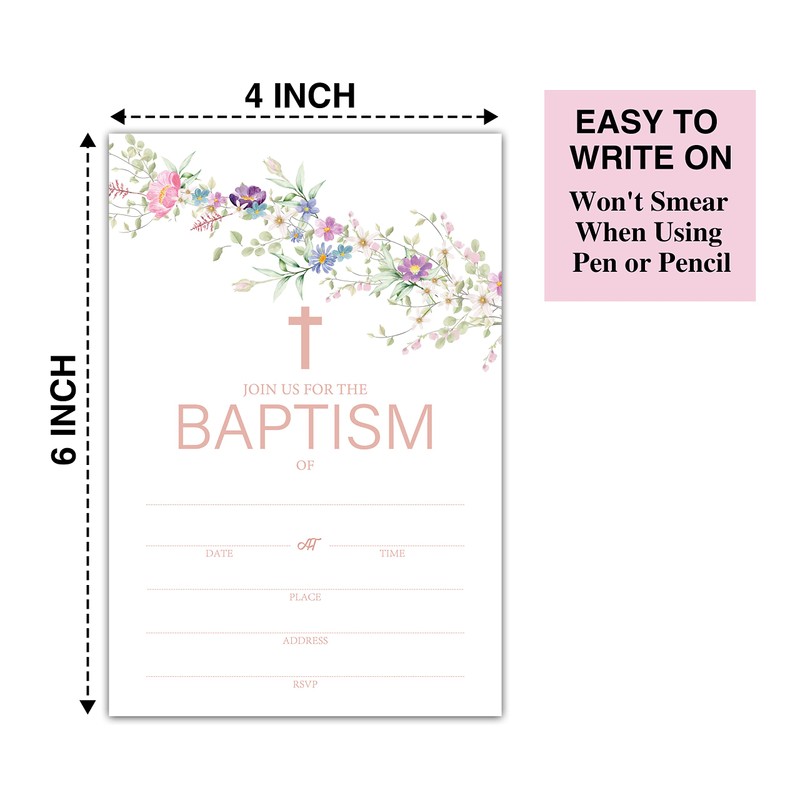- 2.Baptism invitations size 4 inches by 6 inches. The included envelopes measure 4 inches by 6 inches.