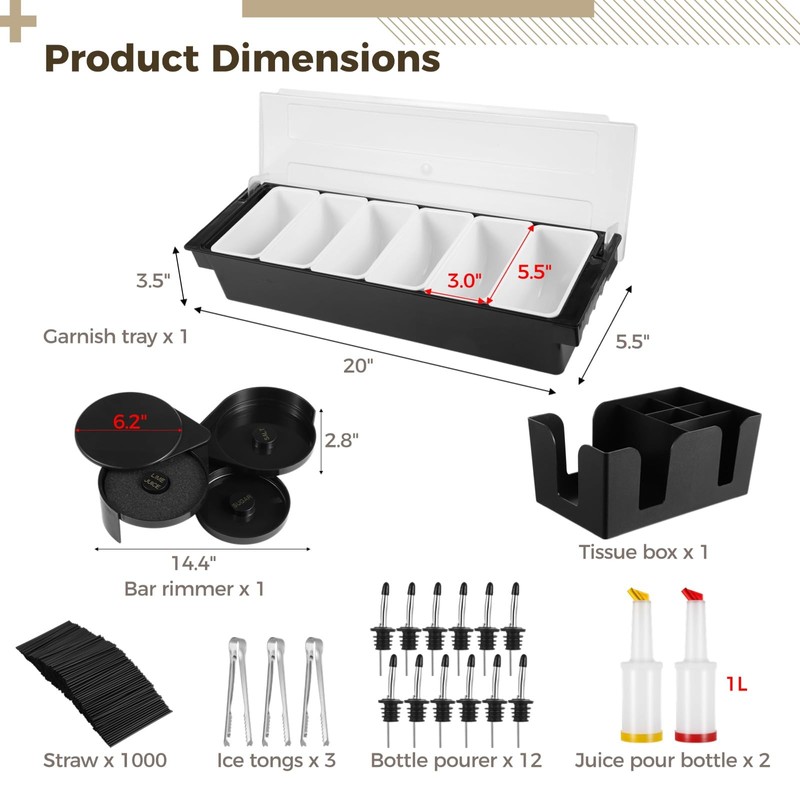 - 【Comprehensive Bar Tool Set】This comprehensive bar package includes a 6-grid garnish tray, napkin holder, juice pitchers, ice tongs, and more. They bring tremendous convenience to your parties and events, making the drinking spree simpler and more enjoyable.
