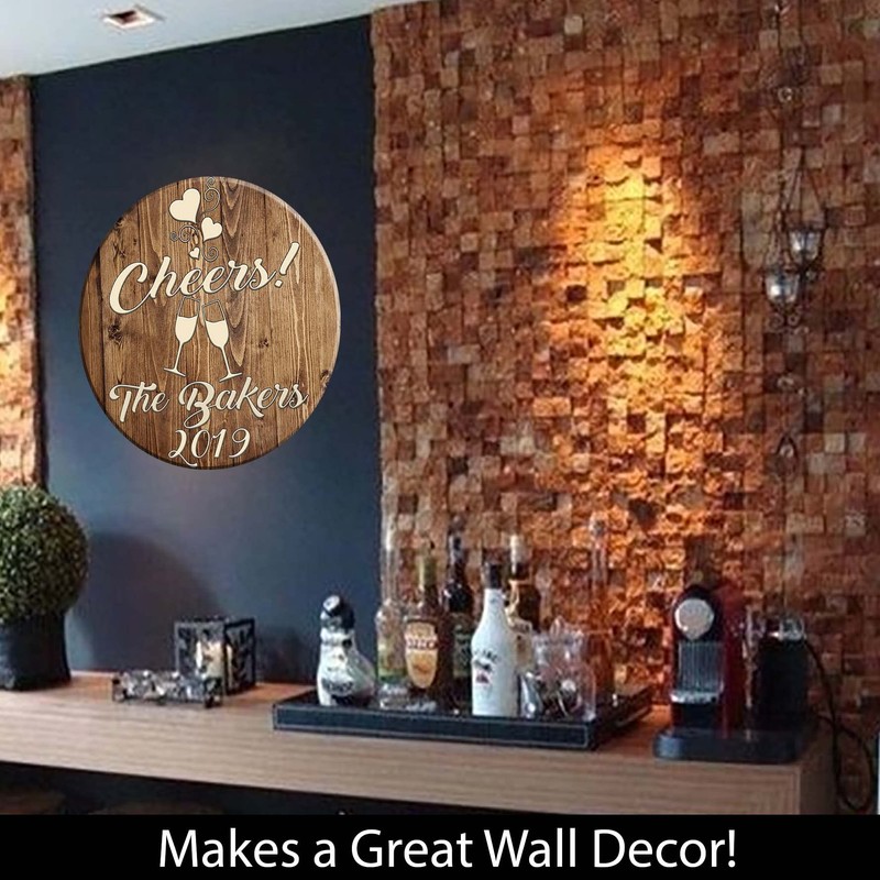 - Fully Customizable, contact us with customization. These Wood Bar Signs are inspired by Whiskey Bourbon Barrel Lids and make Beautiful Wood Wall Art Decorations - Cheers Wedding Toast Wedding Sign Large Oak Whiskey Barrel Lid Wall Decor