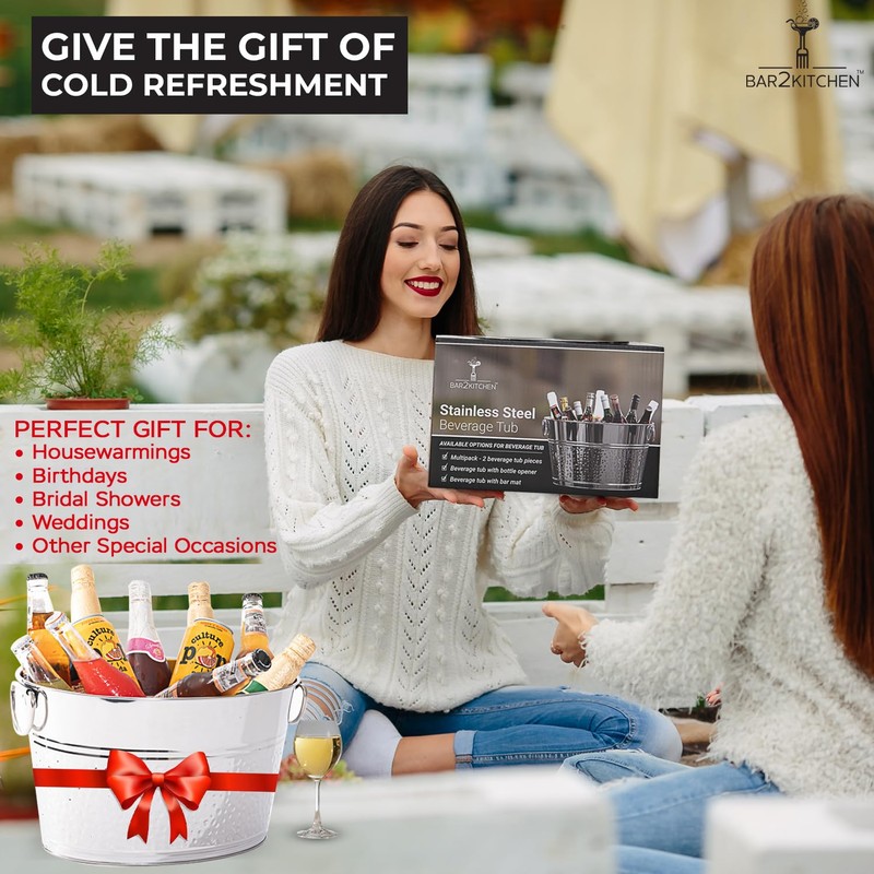 This 2-pack stainless steel bucket for drinks comes in gift ready packaging, so you can give away these elegant tubs as presents for weddings, housewarmings, birthdays, bridal showers, and other special occasions.