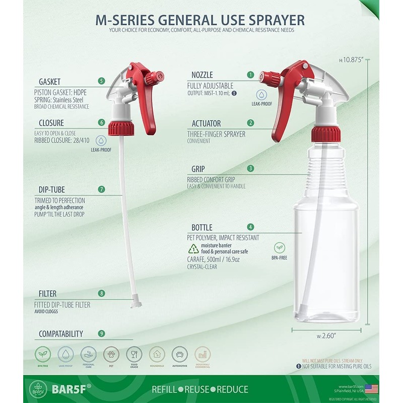 Bar5F Empty Plastic Spray Bottles 16-Ounce BPA-Free Food Grade Crystal Clear Fully Adjustable Sprayer 2-Pack