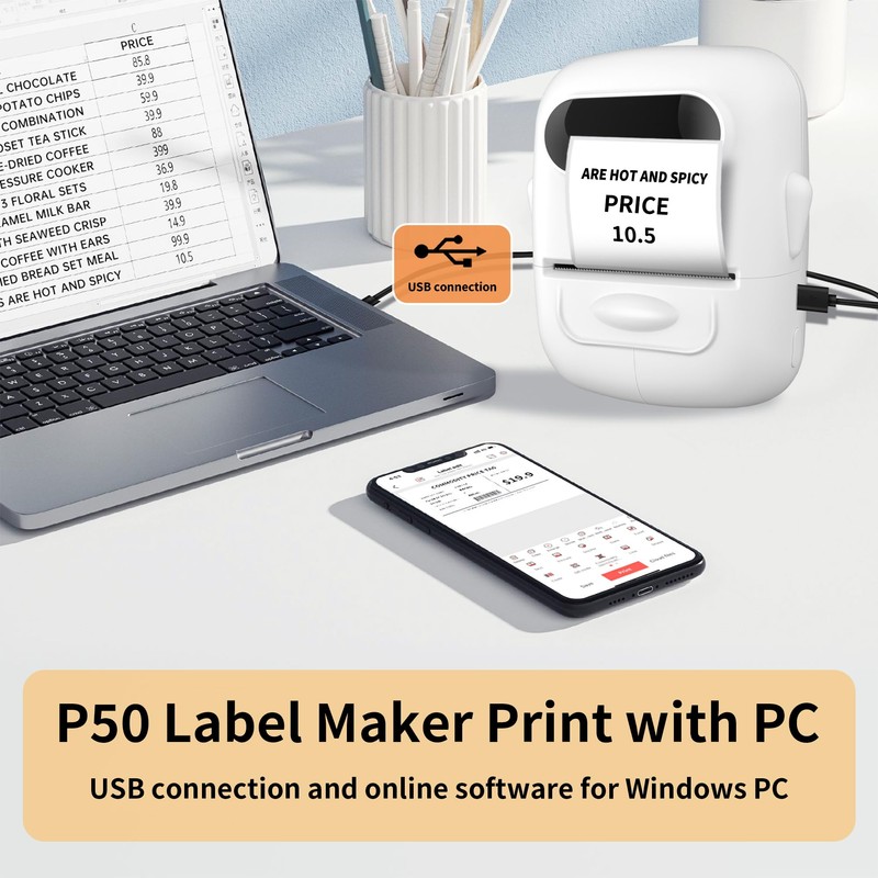 - 【Easy TO Use】P50 Bluetooth label printer supports iOS & Android and PC. Mini Bluetooth wireless thermal label printer, connect to your smart phone in 2 seconds via Bluetooth 4.0. The free App is downloaded from APP STORE or Google Play. USB connection and online software for Windows PC. (Need to download the drive and APP for Windows). Select from the app and connect to model P50 printer to enjoy printing.