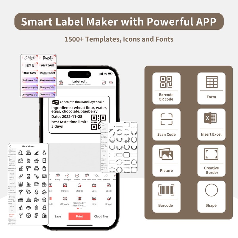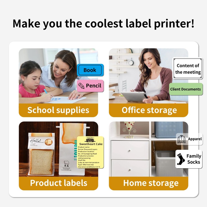 - 【Widely used】There are a lot of templates in APP, provides various graphics,barcodes,QR codes Label,and symbols. you can easily print any label you need. The bluetooth label maker machine which can be used widely in business or household, including jar labels, name labels, price labels, clothing tag labels, jewelry price tag, address labels, labels for home organization, files folder or office equipment, cable labels, decorated holiday gifts and greetings labels, etc.