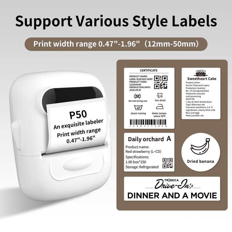 - 【Portable label maker】Mini thermal label maker machine which is lightweight and portable can put into your bag. Supports 0.47"-1.97"(12-50mm) width labels and can print the round label paper, cable label paper, transparent label paper. Mini label maker size: 4.7*3.5*2 inch(12*9*5 cm). Weight: 0.45lb. The P50 address label maker comes with 1 roll 40 x 30mm(1.57"x1.18") White labels, Type-C charging cable and instruction manual.