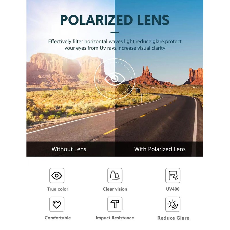 • POLARIZED LENS - Polarized lenses reduce glare reflected off of roads, bodies of water, snow, and other horizontal surfaces,reduce reflective. UV400 protection, protect from uva/uvb rays. Restore true color, eliminate reflected light and scattered light and protect eyes perfectly. TAC Polarized Lens are also impact resistant, durable and hard to break.