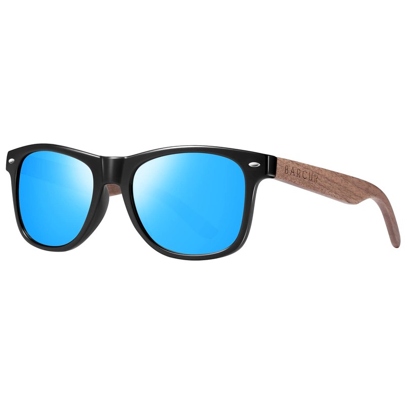 Barcur Wood Sunglasses for Men Women Polarized, uv Protection Black Walnut/Zebra Wooden Arms Frame Shades with Case(Walnut temple Black Blue)