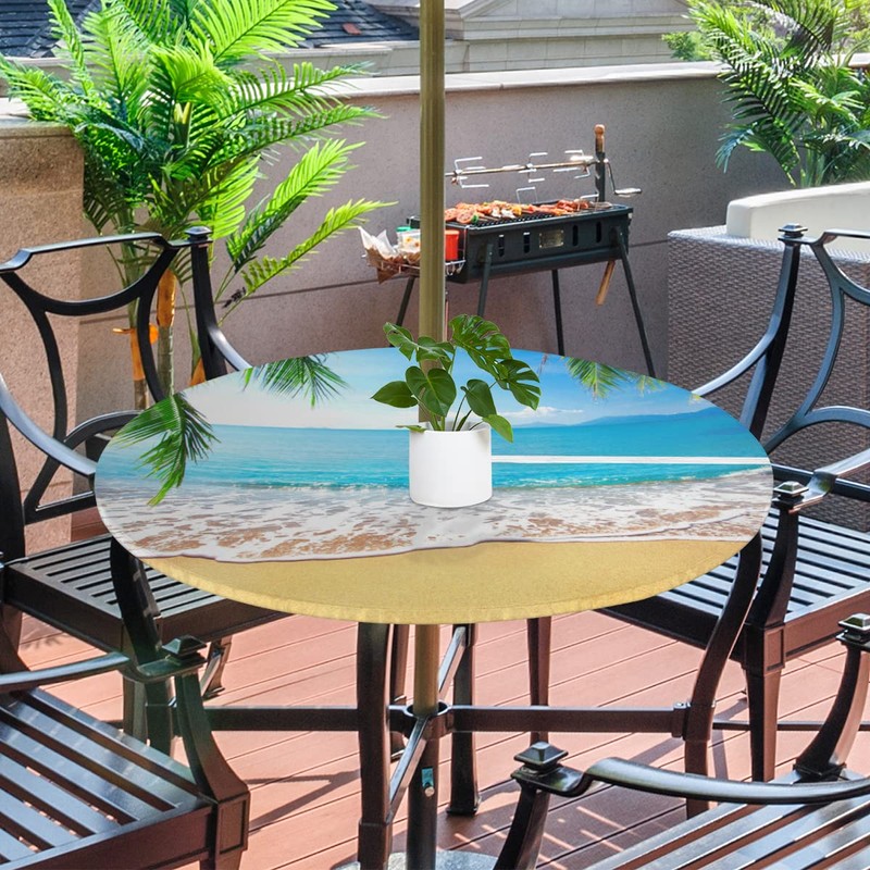 Bardic Outdoor Tablecloth Beach Palm Round Fitted Table Cover with Zipper and Umbrella Hole, Waterproof Elastic Edged Table Cover for Party, Picnic and Patio, Fits Tables up to 36''-44'' Diameter