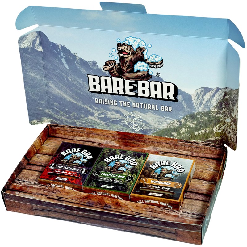 - Elevate Your Shower Experience with Bare Bar's 3 Bar Bundle for Men! Our Natural Men's Soap set includes Molten Lather, Fresh Cut Pine, and Woodsman – handcrafted cold process bars. Each bar offers a deep, invigorating cleanse with a rugged woodsy scent, perfect for a true manly feel.
