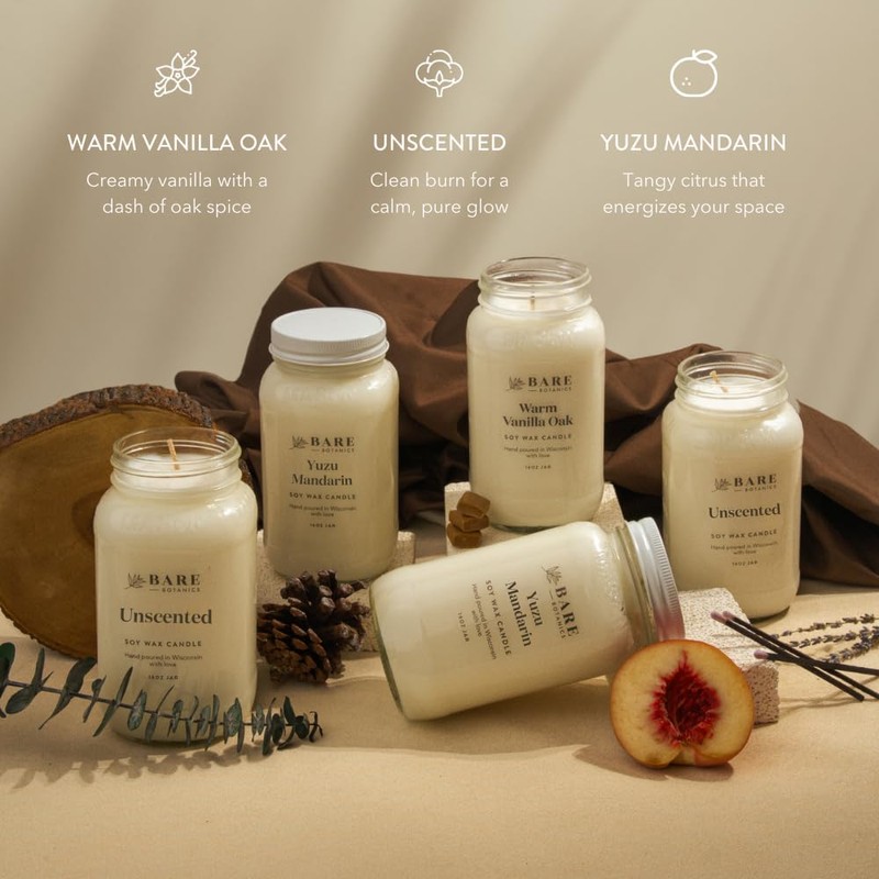 Bare Botanics Warm Vanilla Scented Soy Candle 16 oz (Large) - Handpoured in USA - Naturally Scented Candle for Home - 50 H Long Burning, Aromatherapy, at Home Spa