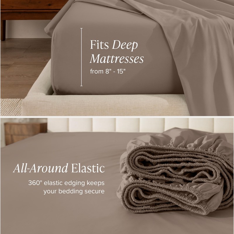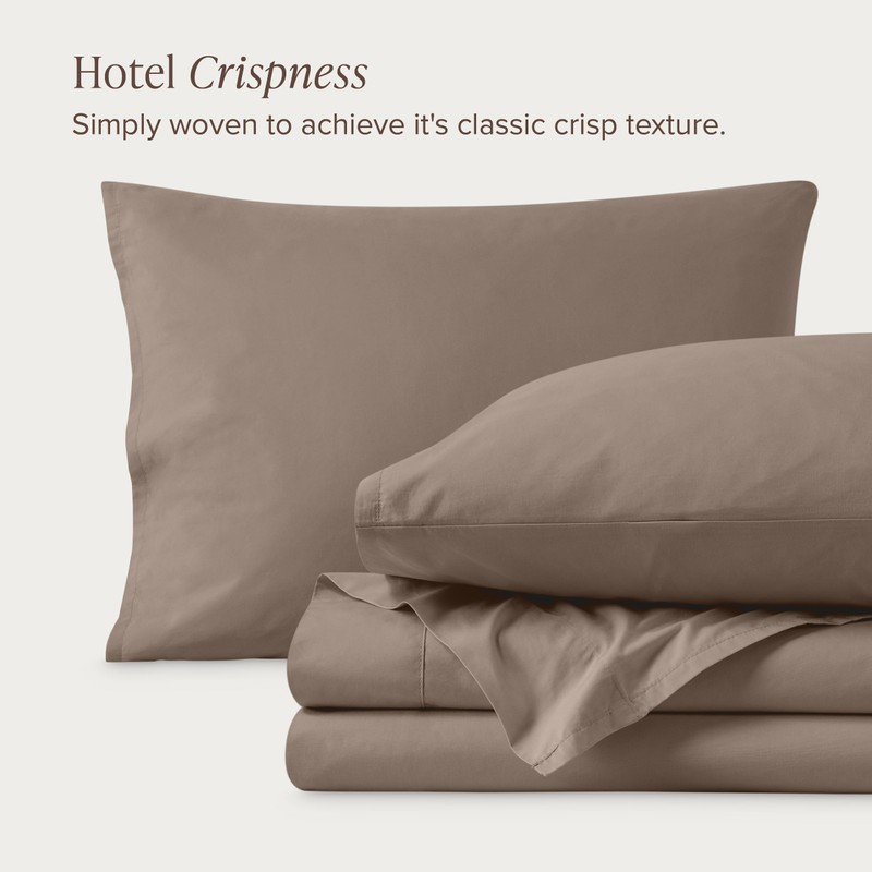 • SET THE STANDARD: Our Queen Percale Sheet Set is crisp to the touch and beautiful to look at. Our 4-piece queen sheet set is made to impress from first rest and gets softer with each wash. SET INCLUDES: 1 Queen Fitted Sheet (60" x 80" x 15" deep pocket), 1 Queen Flat Sheet (90" x 102"), 2 Standard Pillowcases (20" x 27"). Fits mattresses up to 15” deep.