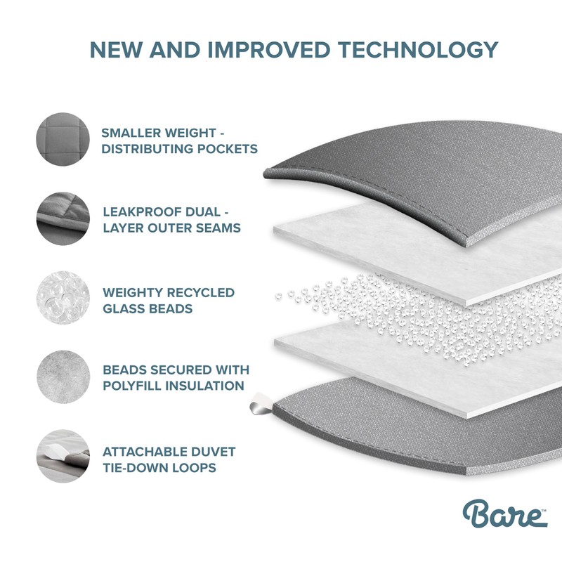 - UNIQUE DESIGN: The structure of Bare Home Weighted Blanket is designed with reinforced stitching to prevent beads from shifting or leaking while you are sleeping. Smaller pockets allow for even distribution of weight over the surface of the body. Our blanket features corner loops that can be used to secure a Bare Home Duvet Cover with corner ties. OEKO-TEX Standard 100 Certified free from harmful chemicals and dyes. Label ID: BJ025 166847