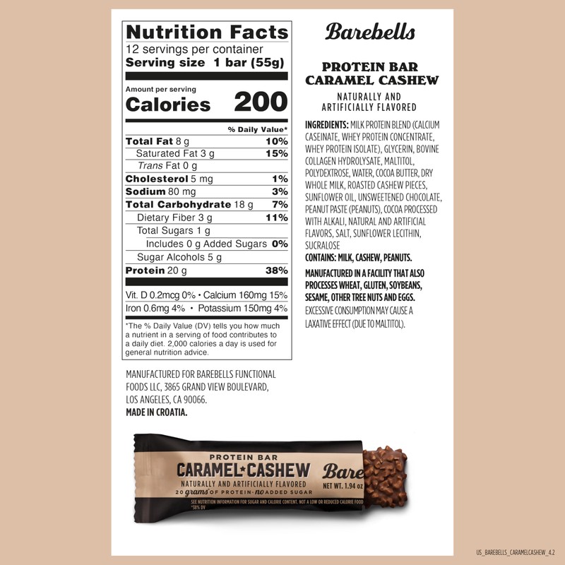 - BAREBELLS CARAMEL CASHEW PROTEIN BAR - 12 individual yummy Barebells protein bars! Tired of eating bars that taste like cardboard? This Caramel Cashew protein bar is far too gooey and chocolaty to compare to anything but the most decadent of desserts; and yet it has 20 grams of protein and *no added sugar. Staying fit has never been this delicious. Caramel Cashew was one of the first flavors launched by Barebells and is still a favorite worldwide.