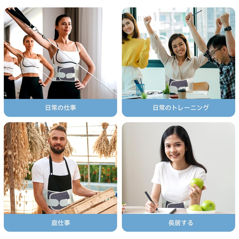 - 多彩なシーンで活躍:運動、お子様の抱っこ、デスクワーク、立ち仕事、長時間の運転など、さまざまなシーンで腰を快適にサポートします。