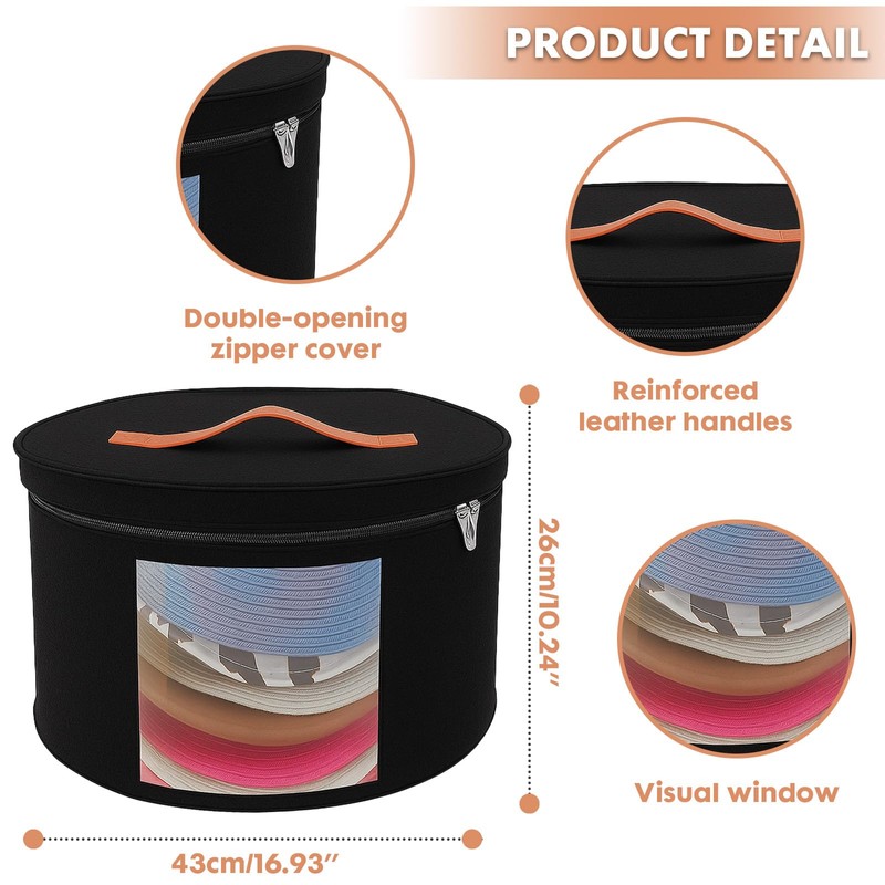 - 【Multi-functional】Hat storage box large capacity design with a diameter of 16.9 cm × height of 10.24 cm, can store multiple wide-brimmed hats, cowboy hats, baseball caps, etc. The compartment area cleverly stores gloves, sunglasses and other accessories, and can also be used as a clothing storage box when travelling.