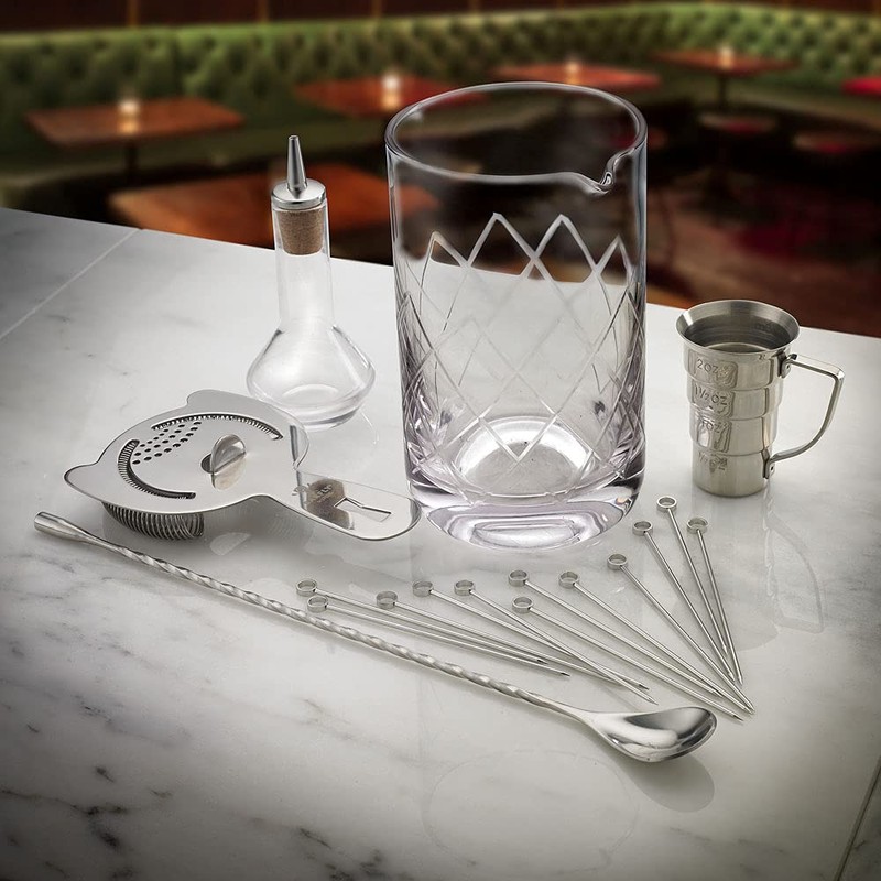 - SET INCLUDES: 24 oz Mixing glass, heavy-duty spring bar strainer, stepped jigger w/ handle, classic bar spoon, cocktail picks, and bitters bottle w/ stainless top
