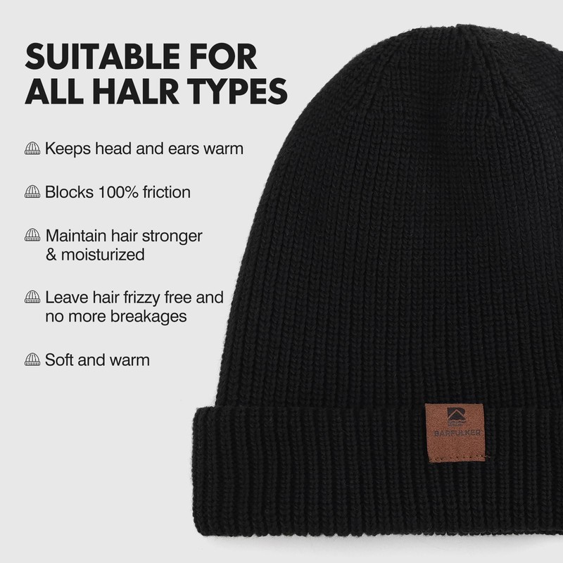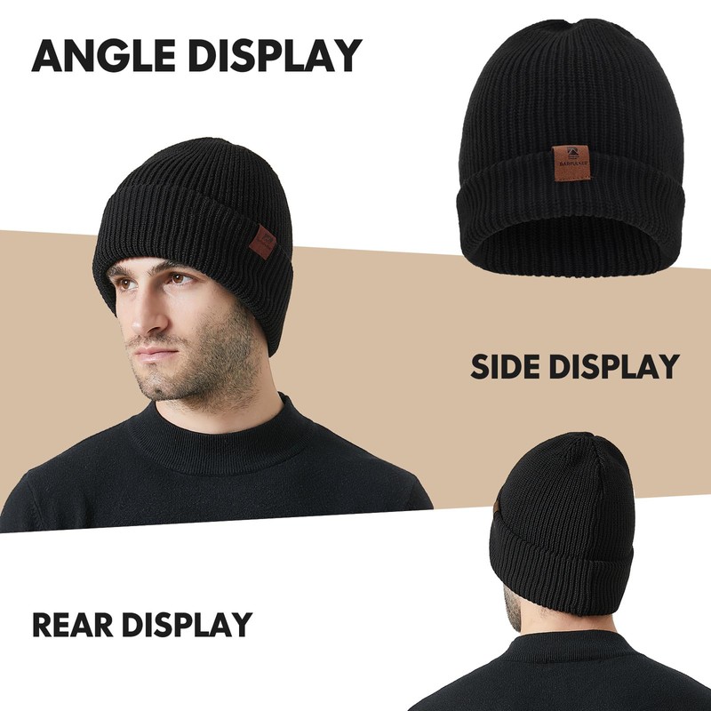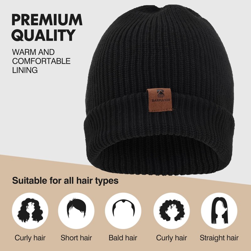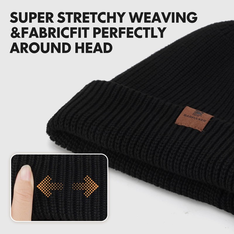 BARFULKER Beanie Hat Women Men Winter Warm Knitted Hat Winter Hats Thermal Running Hats Stretchy Soft Wool Hat with Cuffs and Thick Warm Lining Gift Unisex, black