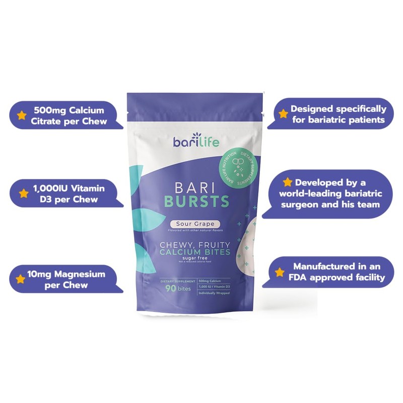 Bari Life BariBurst Calcium is a delicious way for you to get your calcium citrate after gastric bypass, gastric sleeve and duodenal switch. Just 3 chews per day give you 1,500mg of calcium from Calcium Citrate.