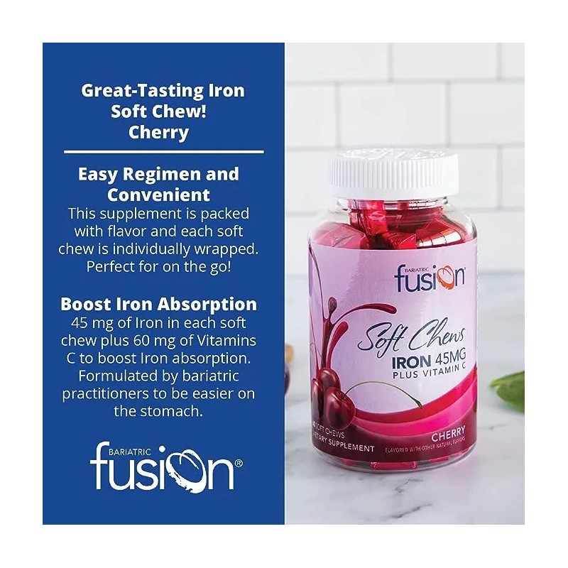 Bariatric Fusion® Cherry Bariatric Iron Soft Chew with Vitamin C 60 Soft Chews Masticables I Suplemento Nutricional Con Alto Contenido en Hierro, Apoyo Energía y Reducción de la Fatiga Post Cirugía.