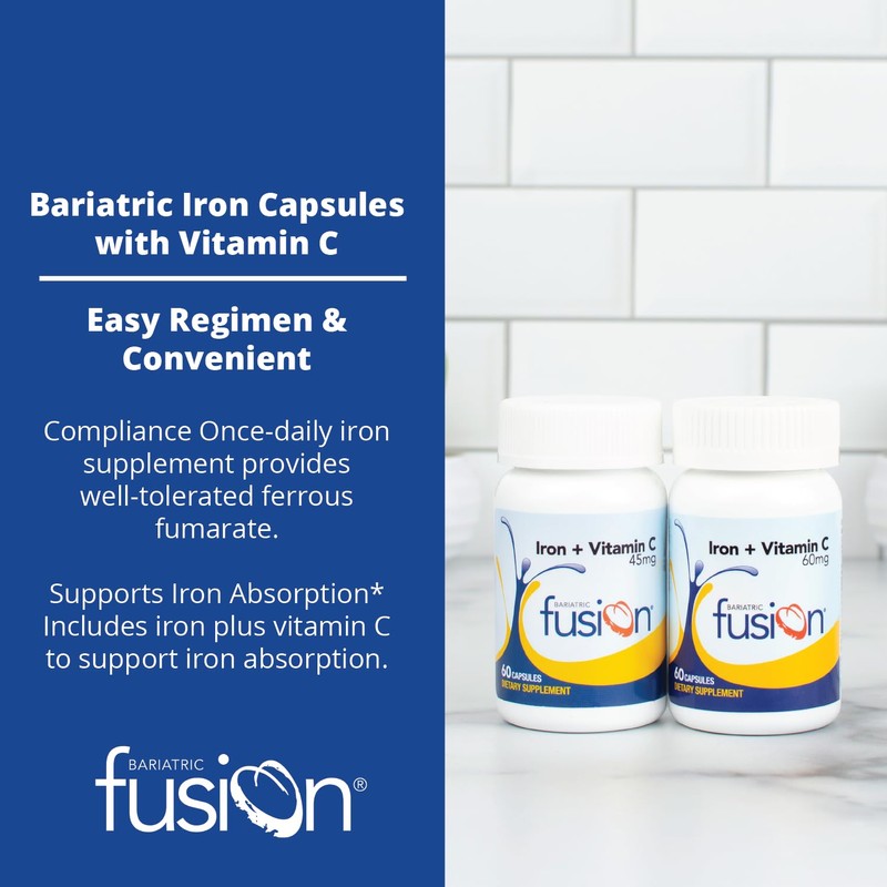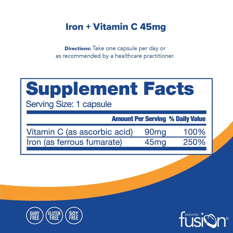 - Bariatric Formulation: Bariatric Fusion Bariatric 45mg Iron Plus Vitamin C Capsules are an easy, affordable, and convenient way for bariatric surgery patients to meet their daily iron requirements. With just 1 capsule daily, this formula provides well-tolerated and bioavailable ferrous fumarate iron with vitamin C to support iron absorption.*
