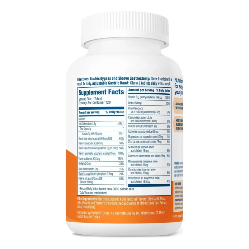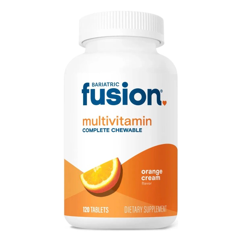 - Bariatric Fusion® Multivitamin Complete Chewable Sabor Orange Cream 120 Tabletas Masticables I Suplemento Nutricional Con Vitaminas y Minerales Esenciales Post Cirugía Bariátrica, Manga Gástrica o Bypass Gástrico. Sabor: Orange Cream / Crema De Naranja "NUEVA presentación. Puedes recibir cualquiera de las dos versiones por un tiempo limitado." Este suplemento ha sido elaborado en un laboratorio aprobado por la FDA Bariatric Fusion® | Multivitamin Complete Chewable Ingredientes: Vitamina B12 140mcg, Biotin 150mcg, Vitamin A 560mcg, Vitamin C 45mg, Vitamin D 18.8mcg, Vitamin E 5mg, Calcium 300mg, Iron 11.3mg, Magnesium 100mg, Zinc 7.5mg, Selenium 18mcg, Chromium 30mcg. Entre otros. Consulta la tabla nutricional para mayor información. Contenido neto: Bote con 120 Tabletas Masticables Origen: USA Servicios por envase: 120 Multivitamin Complete Chewable sabor Orange Cream es un suplemento nutricional diseñado específicamente para personas que han pasado por una cirugía bariátrica. Este tipo de suplementos es esencial para mantener un balance adecuado de vitaminas y minerales tras una operación de este tipo, donde la absorción de nutrientes puede verse comprometida. Sin lácteos | Sin gluten | Sin soja Beneficios:
