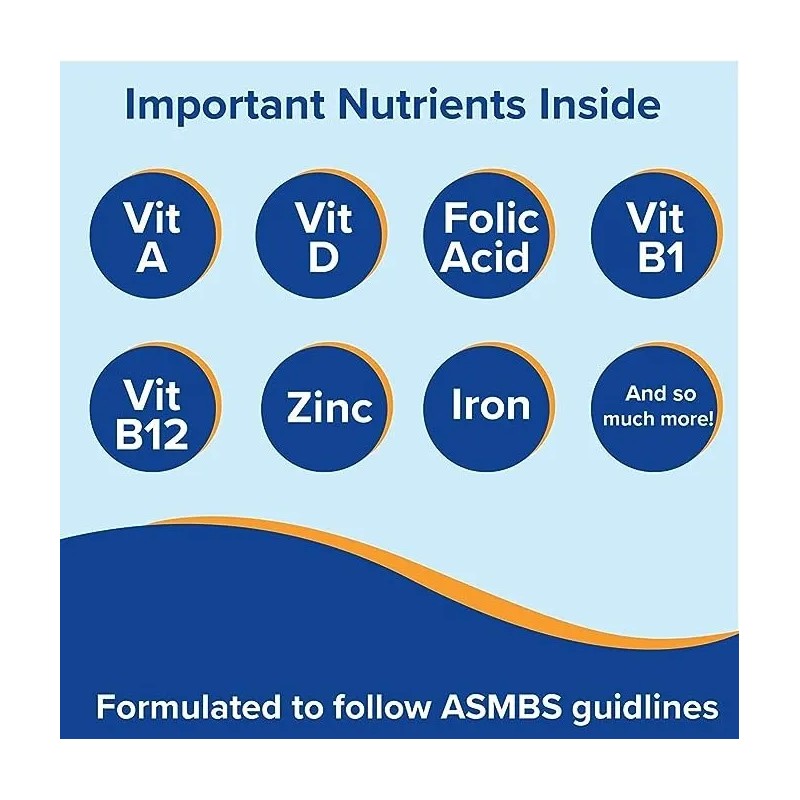 21 vitaminas y minerales diseñados para cubrir necesidades tras cirugía bariátrica, incluyendo vitamina D3 (3,000 IU), complejo B (B12, Biotina, etc.) y más