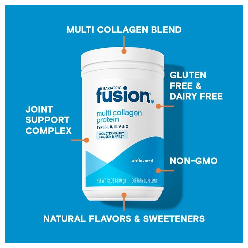 - Bariatric Formulation: A premium daily multi collagen protein powder designed for bariatric patients. This unique Unflavored Multi Collagen supplement contains over 10g of our Multi Collagen Blend, 10g of Protein, and our unique joint complex. Our Joint Support Complex includes MSM, Glucosamine, and Chondroitin that may Ease Inflammation and Promote Joint Support.* Collagen may also help Bariatric Patients with Skin Elasticity after surgery.*