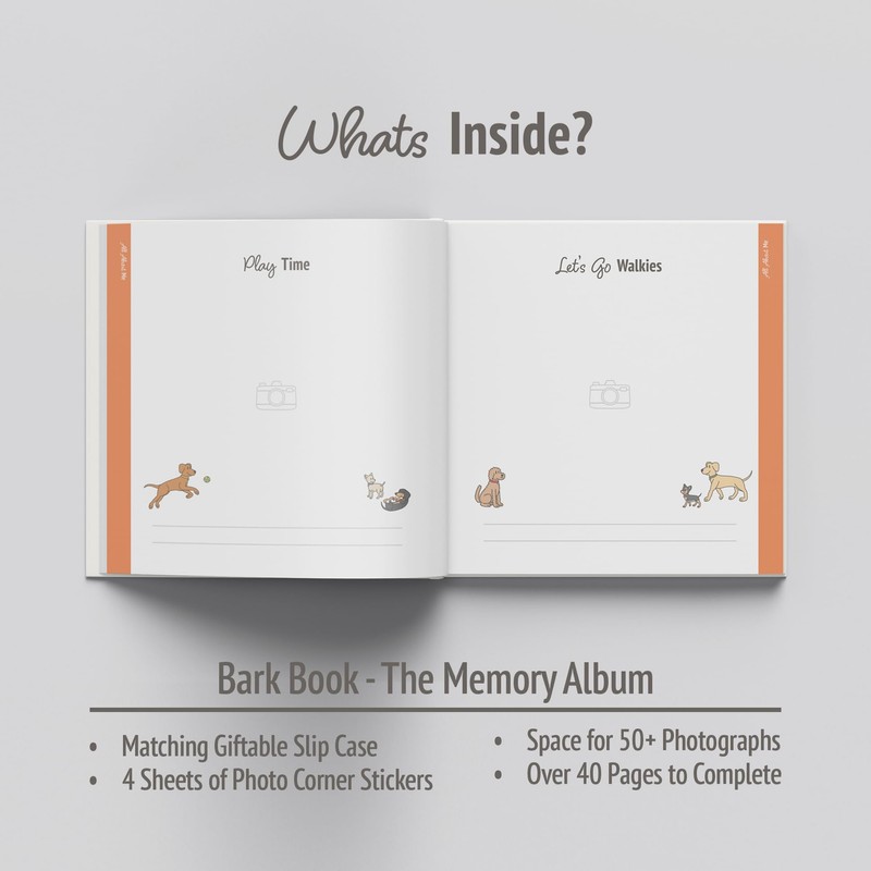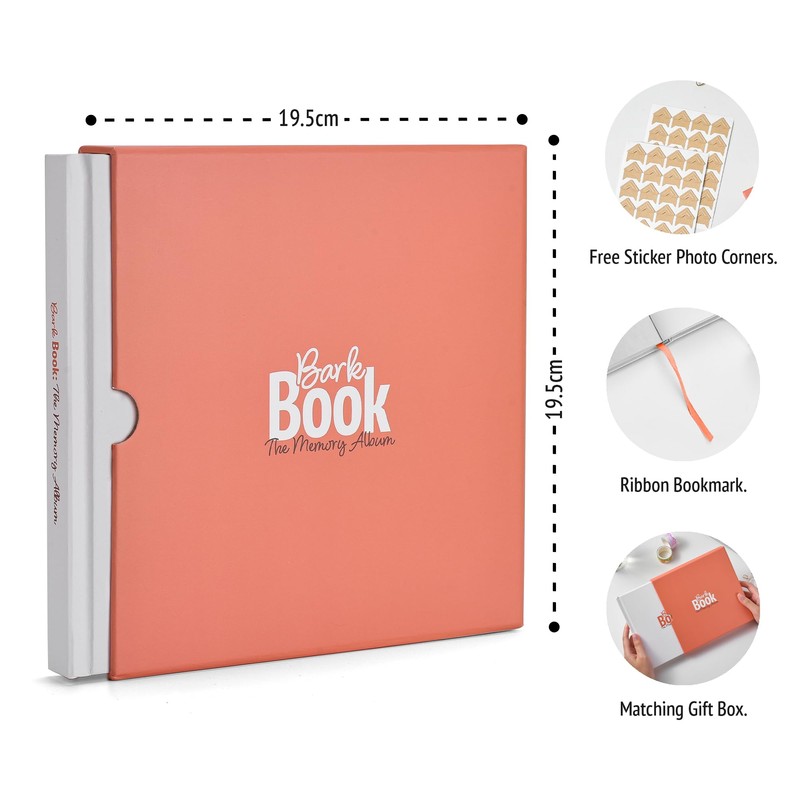Bark Book - A Dog Photo Album and Memory Book for Dog Mum and Dad, Space to Complete 50+ Photos and Paw Prints. 4 Sheets of Photo Corner Stickers. Gift Box Sleeve - Orange