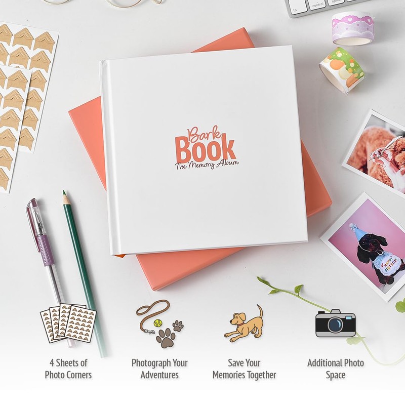 A timeless memory book designed to preserve your photographs and memories for a lifetime. The 'Bark Book' is designed for pet parents to capture every special moment with their beloved dog, creating a lifetime of memories to cherish. From playful puppy days to senior years, this keepsake celebrates your dog's unique journey. With plenty of space for your favorite photos, it’s perfect for documenting beach trips, park adventures, and cozy moments at home. Add your personal notes and captions to make it truly your own. Compact yet spacious, the 'Bark Book' holds years of cherished memories. Whether you're capturing a year or a lifetime of adventures, this journal is a vibrant tribute to the bond you share with your furry friend.